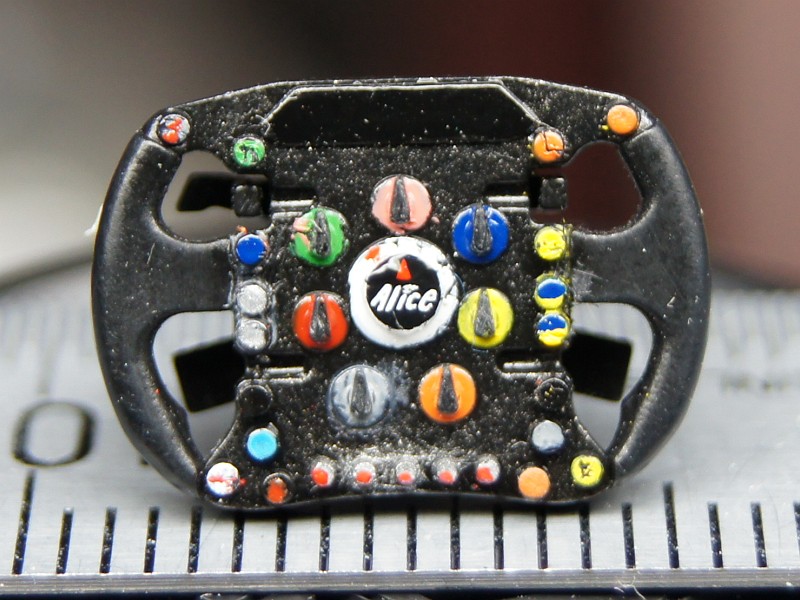 ステアリングホイールは、エナメル塗料でちょんちょんと色を置いていって、はみ出したらナイフやピンの先でカリカリやって、やっと感じでこんなになった。米粒に絵を書くような才能はないんで、もうムリ。