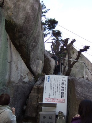 てっぺんまで登るとここから四国の石鎚山が見えるとかで、本物の石鎚山に登れなくてもここから拝めるようにってことらしい。岩に付いた鎖を頼りに登っていくんだけど、小さい子でも登れるくらいの簡単なもの。といっても落ちたら大怪我だけど。小さい頃はこんなところに登ることはできなかったはずなんで、登るのは今回が初めてだった。