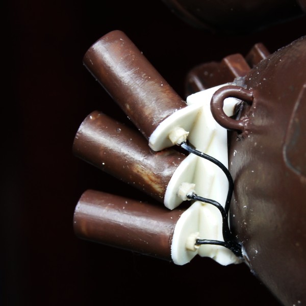 点火コードを付けてみた。基部は付属のボルトパーツ。それに穴をあけて適当なビニールコードを接着してボディーに開けた穴に通して完成。