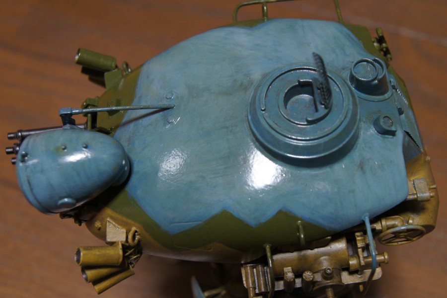 イエロー部やグリーン部を塗り重ねた後、ちょっとキレイすぎた青いところを汚くしてみた。ビンを混ぜないで上の薄いところを筆ですくってぺちゃぺちゃと。こんどはあまりに汚くなった。