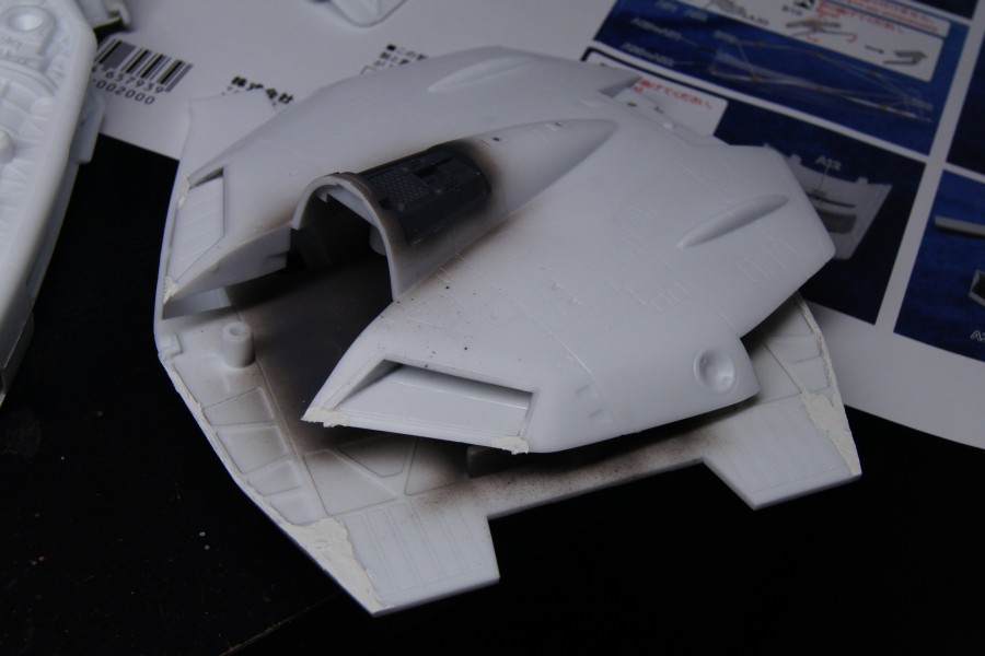 胴体上部はこの辺りまで接着。インテークのパーツC24,25は先にこっちに貼っといたほうが合わせ目消しが楽かも。この状態からでもエッチングパーツは入りそうだし。