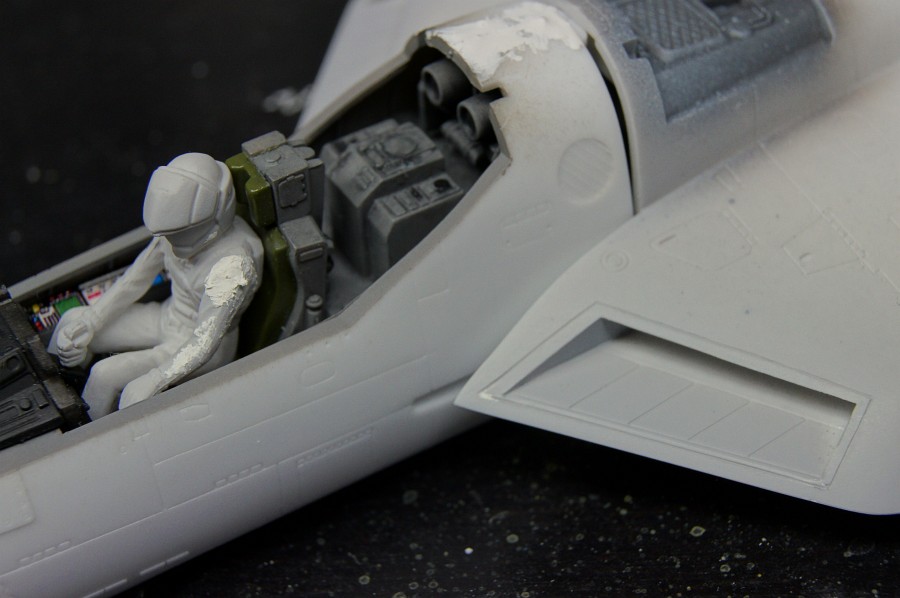 コックピット内部は墨入して、機首は左右を接着した。寂しいのてやっぱりパイロットを乗せる方向で。サブインテークはサフかけて整形したけど、スジ彫りが埋まってしまって彫り直したらちょっとよれてしまった。