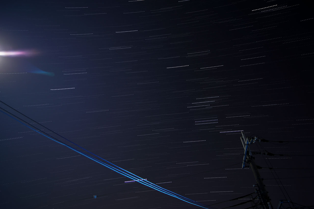 ってことで、約20分間の星の軌跡でも載っけてみます。フォトショで比較(明)でレイヤー合成してみました。左のゴーストは月の明かりです。