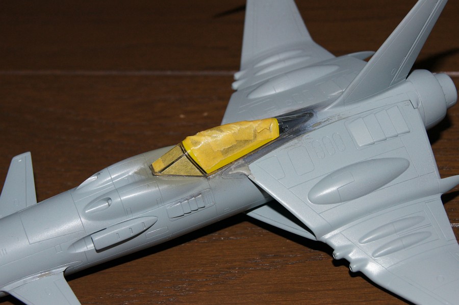 コックピットに載せた後、マスキングしたキャノピーをかぶせたところで今日はおしまい。