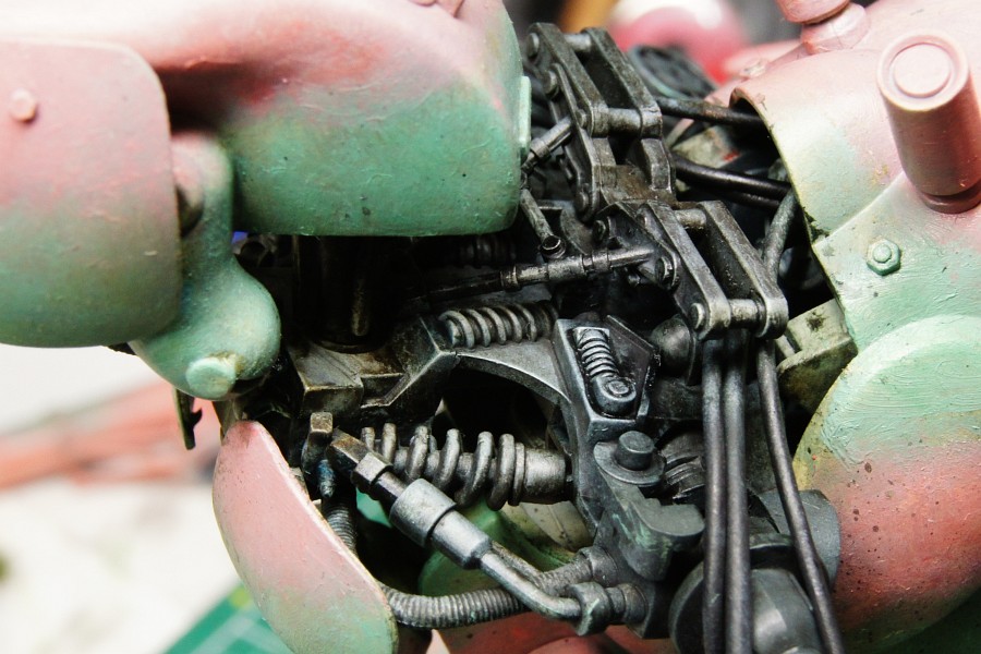 やっぱり油彩を使用。黒、青、茶(だいたいの色ね)を適当な感じに混ぜてちょいうすめてペタペタ塗ると、超簡単になんとなく金属っぽくなる(気がします・・・)。