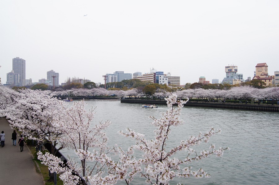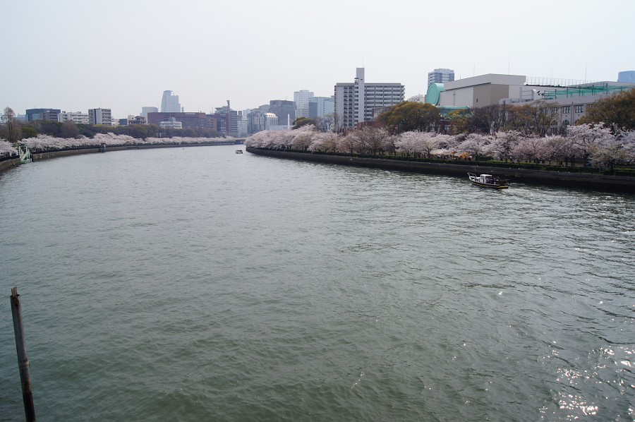 帰りに造幣局の桜を見に行ってみた。右奥が造幣局。川岸の桜は満開。