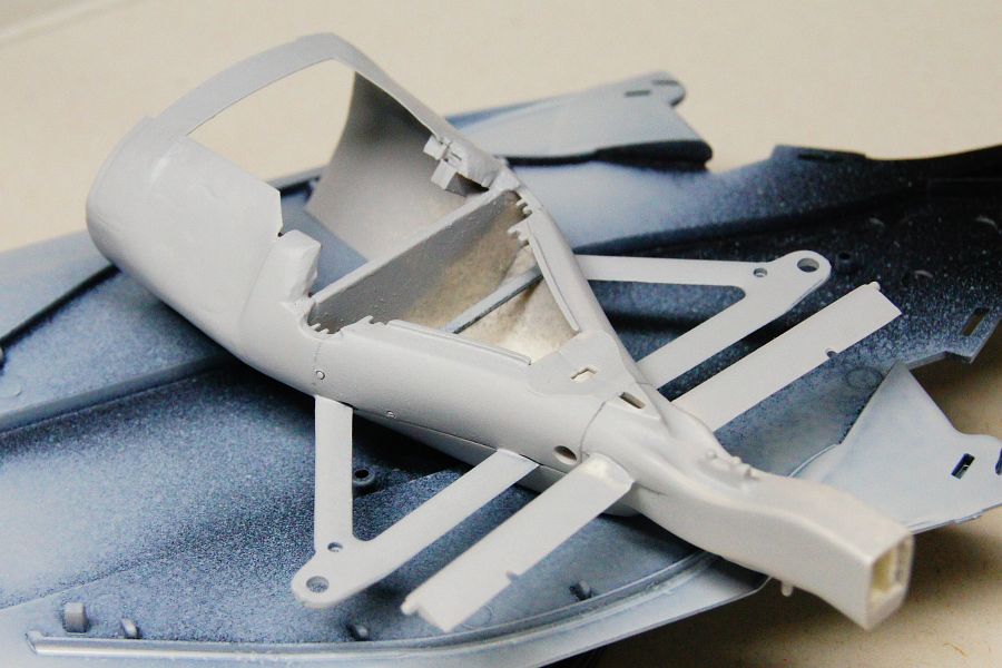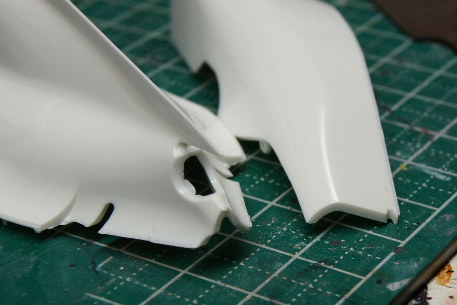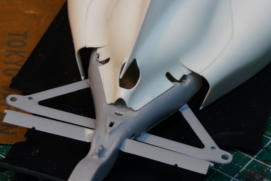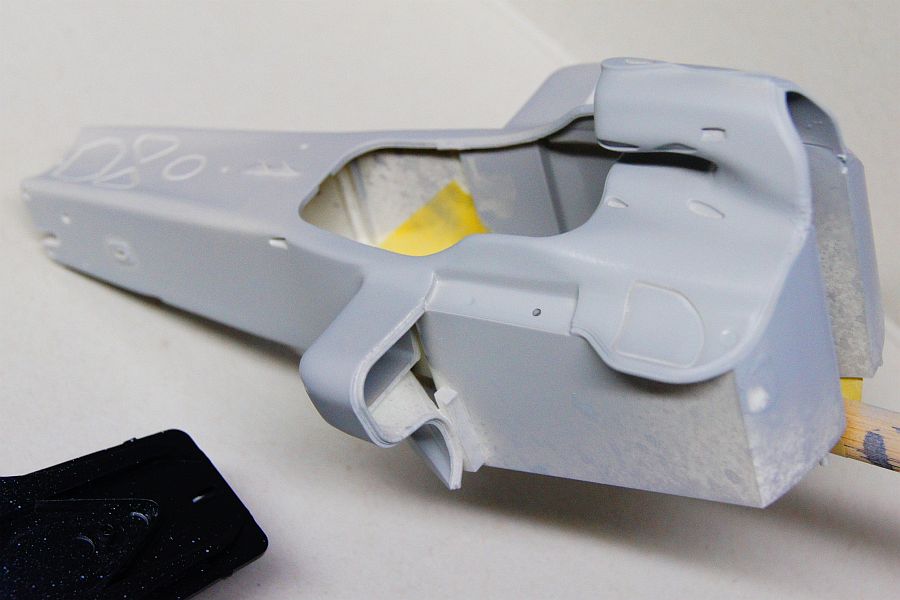 あとは、モノコックまわりの接着線消し。サイドポンツーンのパーツは付け根が弱そうなんで、プラ棒で補強。インダクションポッドの後部も、すきまが目立たないように加工しておいた。