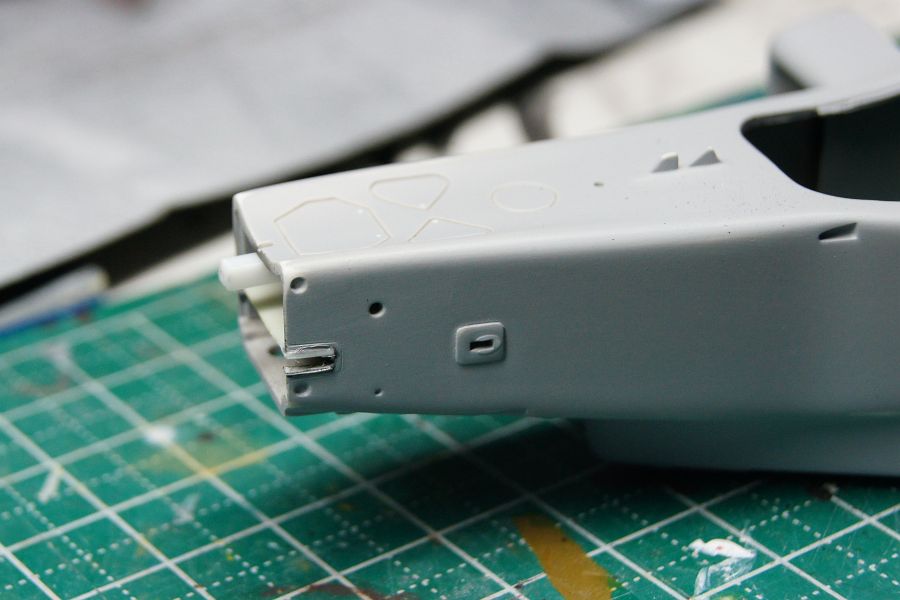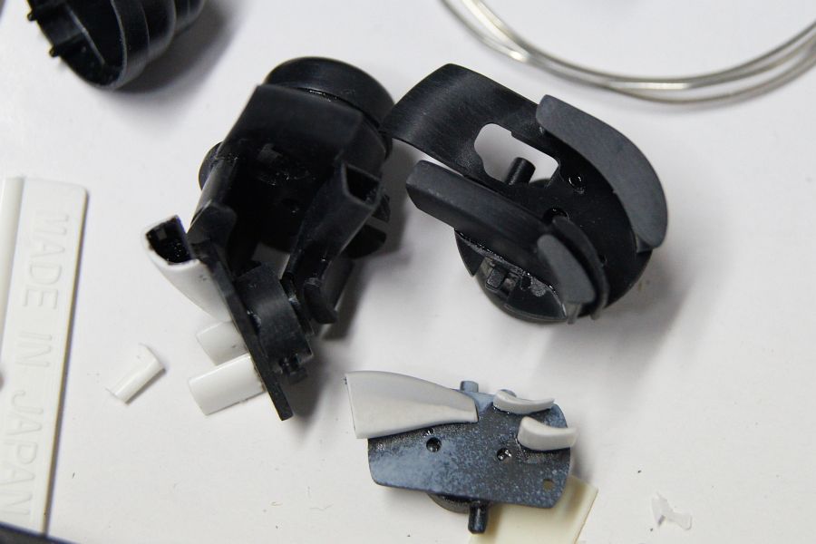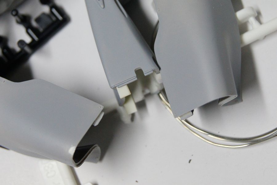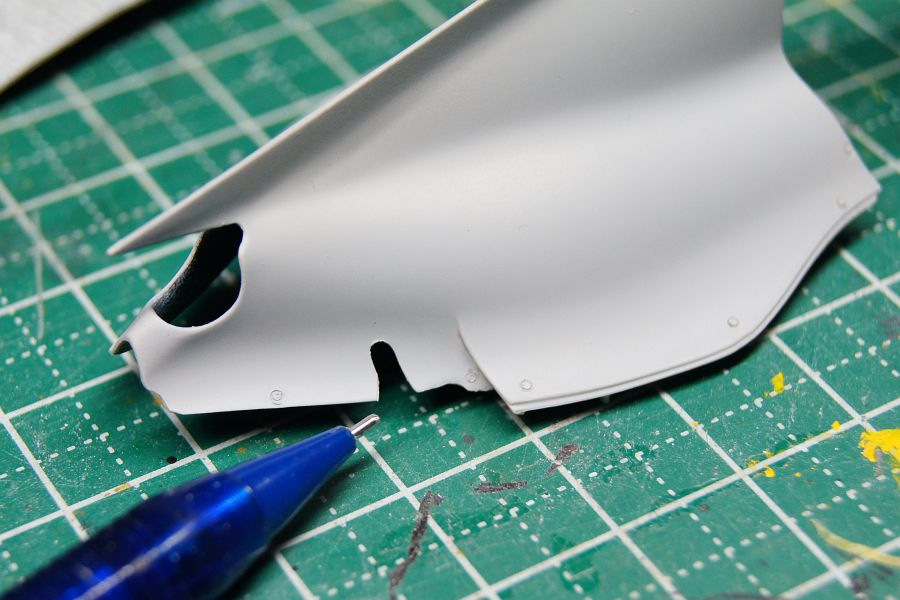 カウル後部の切れ込みをカットして、プッシュロッドが干渉しないようにしておく。カウルの固定ピンのモールドは、シャーペンの先をぐりぐりやって付けてます。これが結構楽でいい。