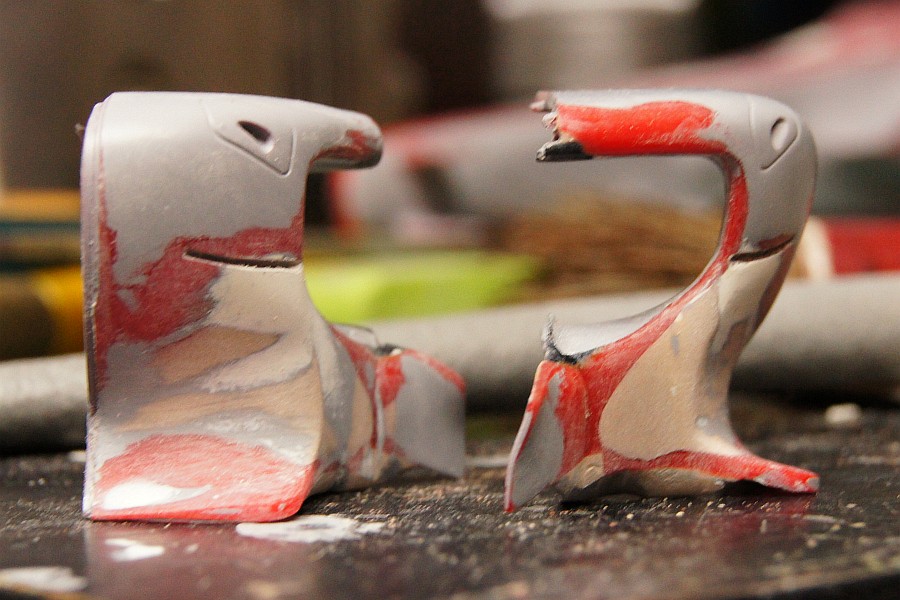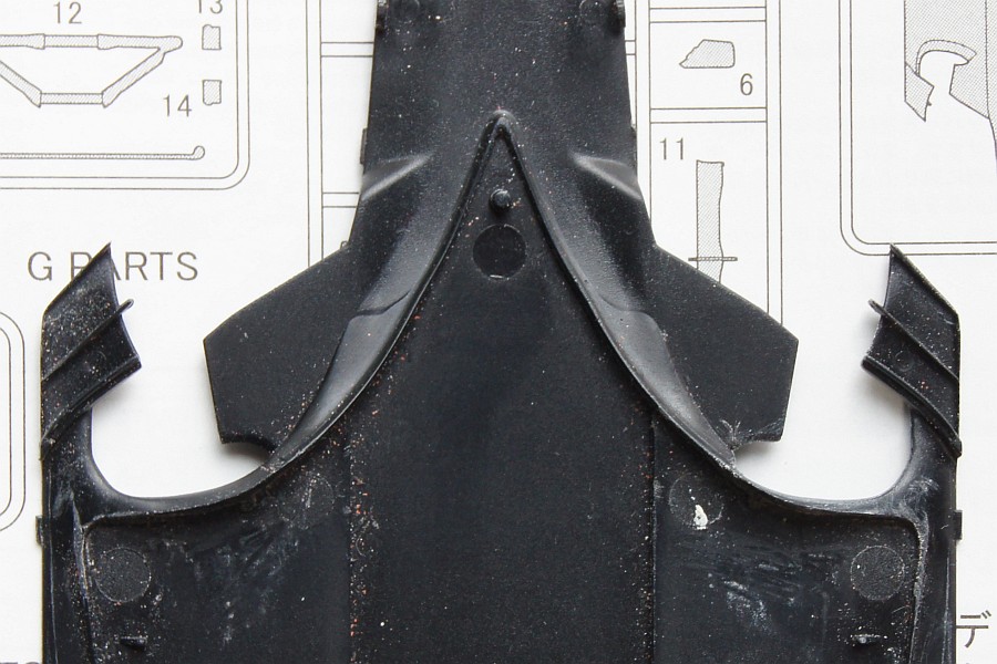 アンダーカウルは削る程度で済ませた。右が修正後。丸みが付いているところを落としてやる感じ。