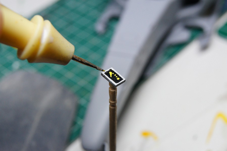 筆でメーターを書くのはムリなんで、ファレホを置いてから針先でつついて整形する。こういう時、隠蔽力が強くて下地を侵さない水性塗料は便利。