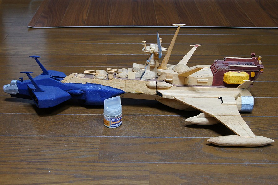 ああ、でも、やっぱりアルカディア号って、2次元のごまかしがあるんで、立体にするのは難しいよね~。 この辺の角度からみるとなんか情けない。紙飛行機に艦橋を付けましたって感じのアウトラインだからね~。