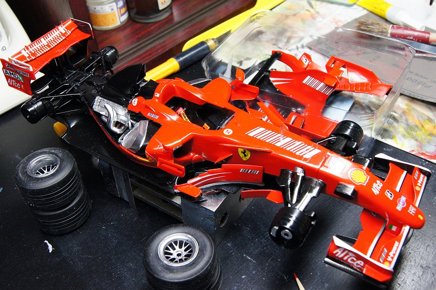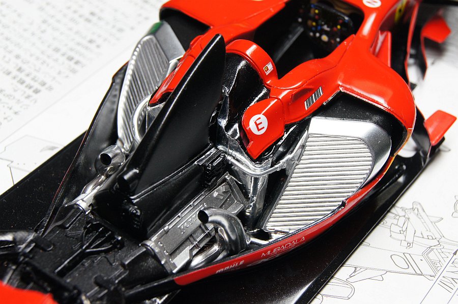 エンジンルームもキットのまんま組み立て。エキパイのパーティングラインさえ消してないぞ。手を入れたのはアルミテープを貼ったくらいだ。