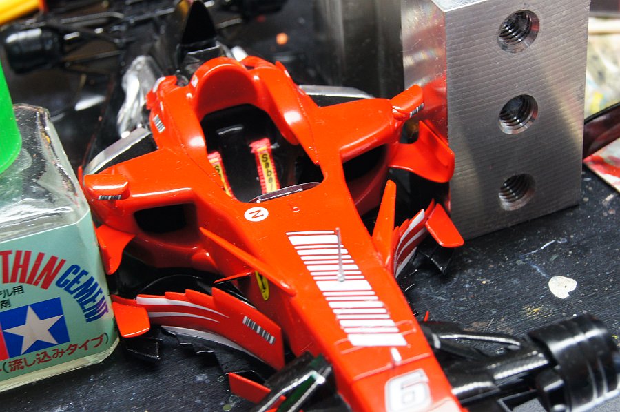 インダクションポッド部は接着しない。実車にないラインは残るけど、おかげでこの状態からでもカウルが脱着できる。
