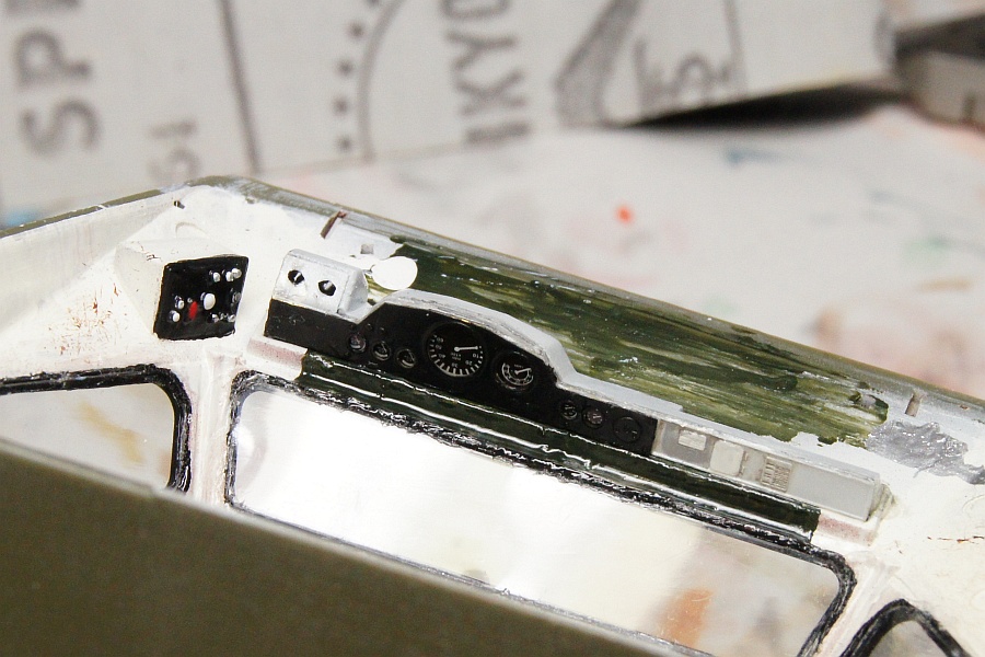 メパネルはエッチングパーツを使用。メーターは印刷済みのクリアパーツがついてるんだけど、エッチングパーツの穴位置に全く合わないんで、切り刻んで木工用ボンドで接着した。