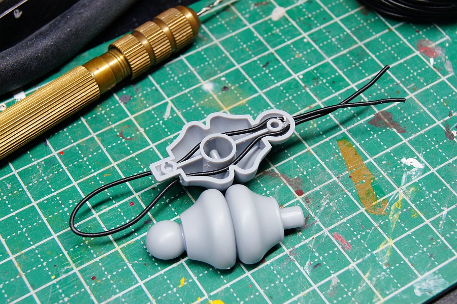 えー、まずは頭?と胸?をつなぐ蛇腹?に線を通しておきます。