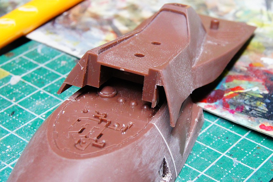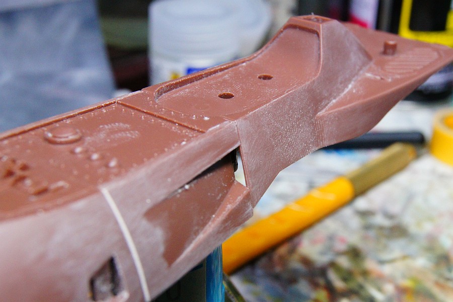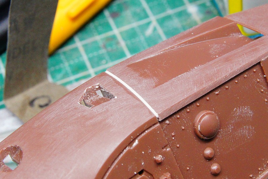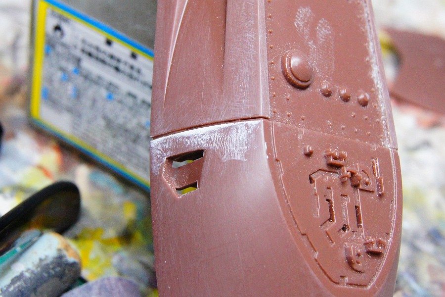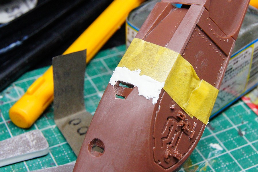 スジボリを埋めないようにマスキングしてパテ埋めし、