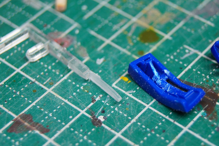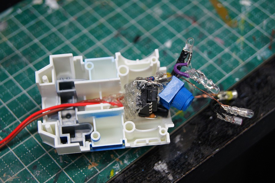 青く光る2つの四角いところは、穴を開けたあとで、透明ランナーの番号部分の板にナイフで格子模様をいれてそれっぽく。