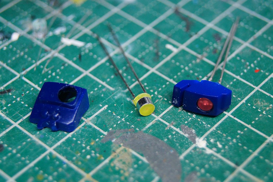 前後のモノアイ?は、3mmの穴を開けてLEDを挿入。ちょっとぶかぶかになったんで、アルミテープを巻いてやった。実機はぼわっと光るんでプラ版とかで蓋をしたほうがよいかもしれないけどパス。