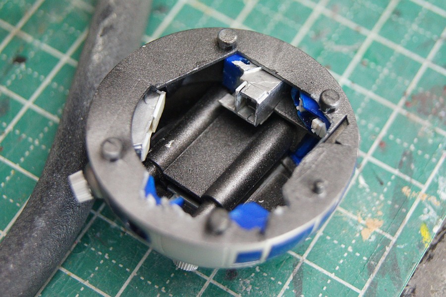 前向きのカメラっぽいのはレイア姫を3Dプロジェクションしていたんで光ってもいいかなと思い、電源を入れるだけでゆっくりいろいろな色に変化するイルミネーションLEDを仕込んでみた。