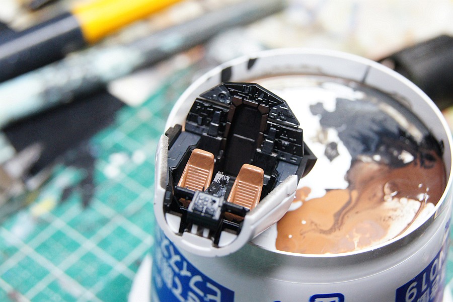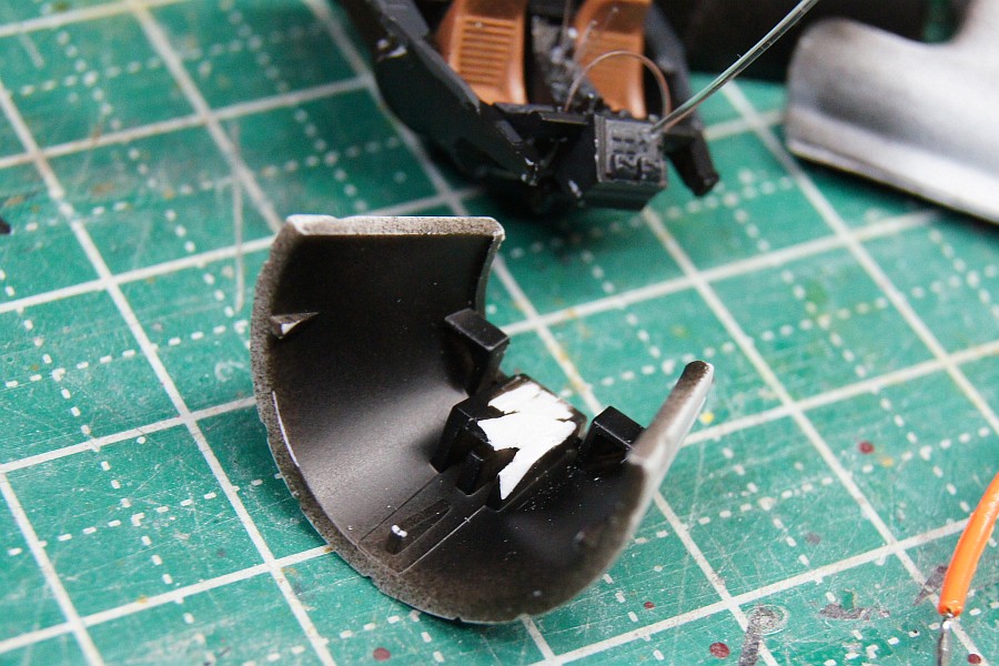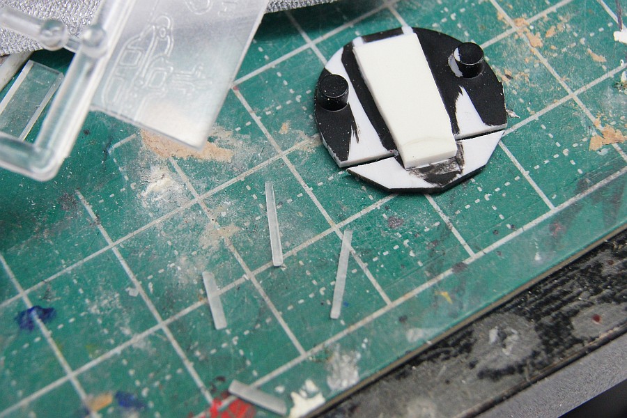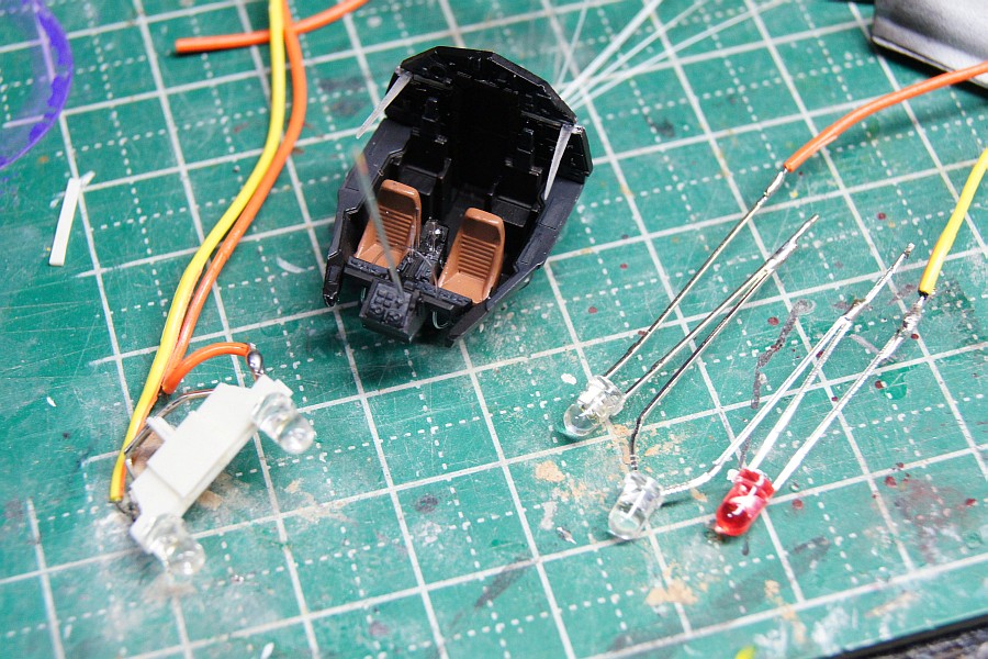 コックピットは、どろぼうひげさんの方法を参考にやってみました。ただ、太めのファイバーを持ってないんで透明ランナーを切り出して蛍光灯部分のパーツを作成。
