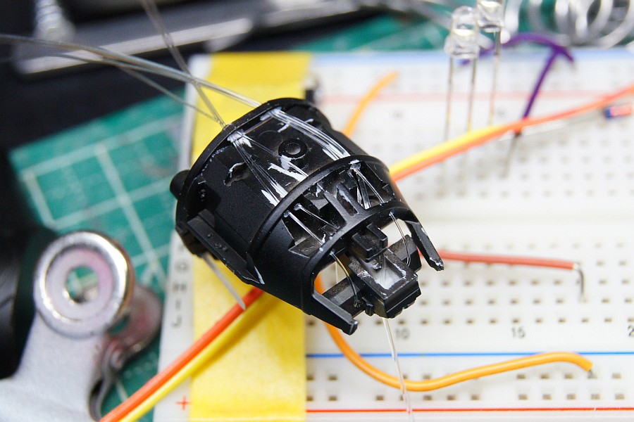 半田付けしたあと、プラ版に穴を開けたものをグルーガンでくっつけてから、固定用のプラ版で位置を決めていき、裏を黒く塗ったプラペーパーで遮光しております。