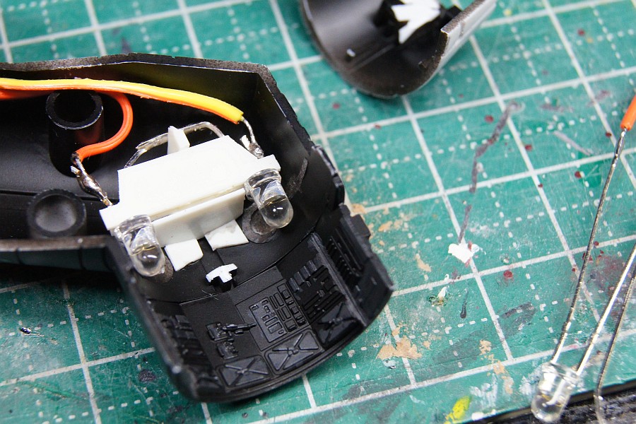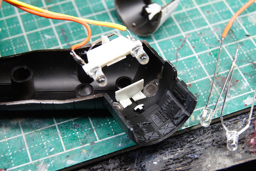 サイドの蛍光灯も裏から光らせるんで、パーツを上から見たら先細りにしてみたけど、うまく光ってくれるでしょうかねえ?