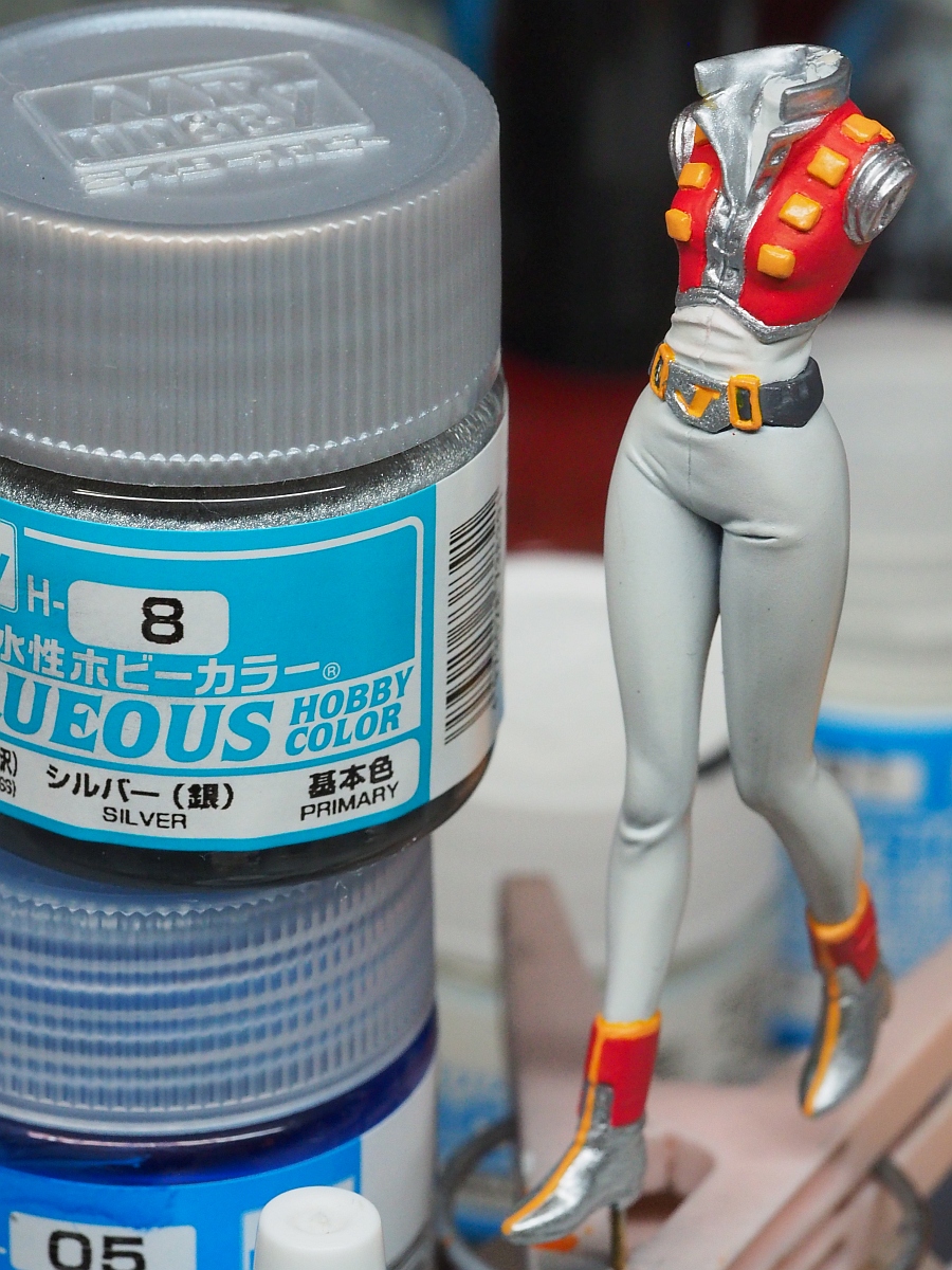 シルバーは新水性の8番。かなりギラギラに仕上がる。ベルトはアクリジョンベースカラーのグレー。