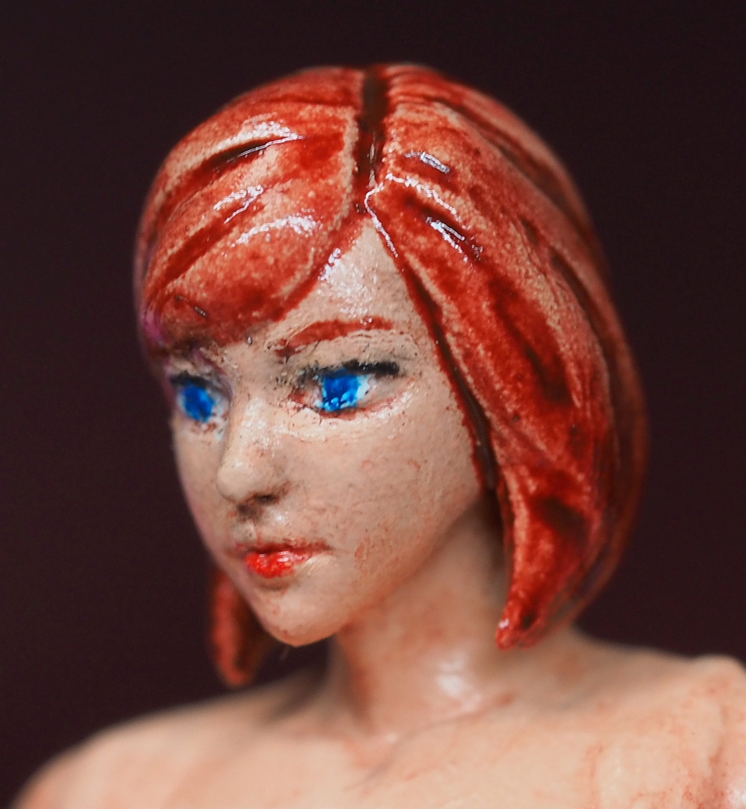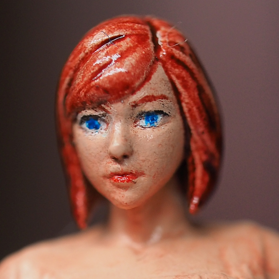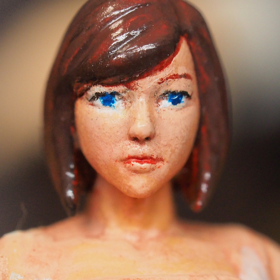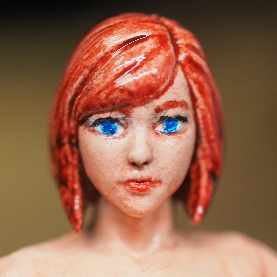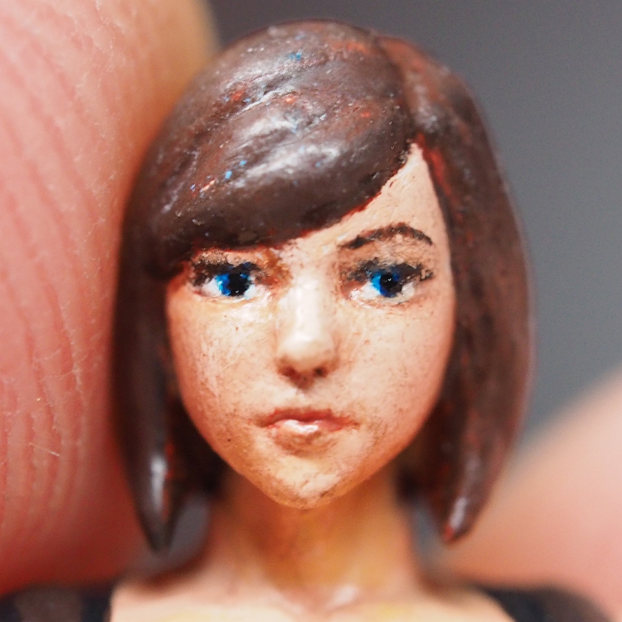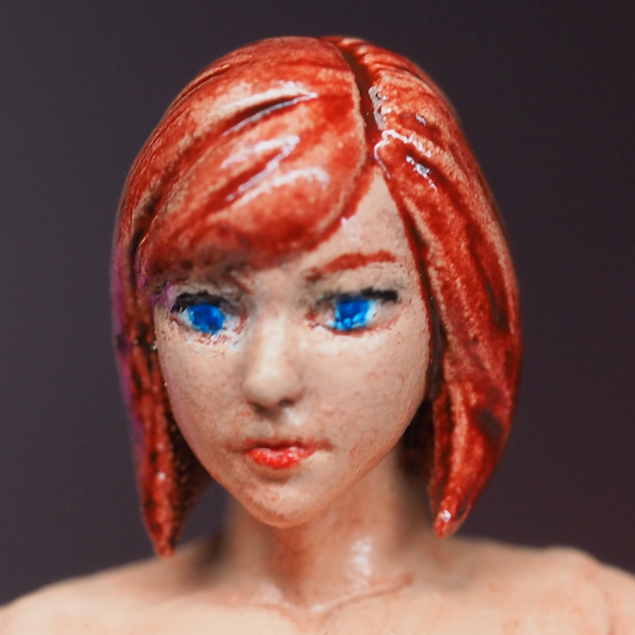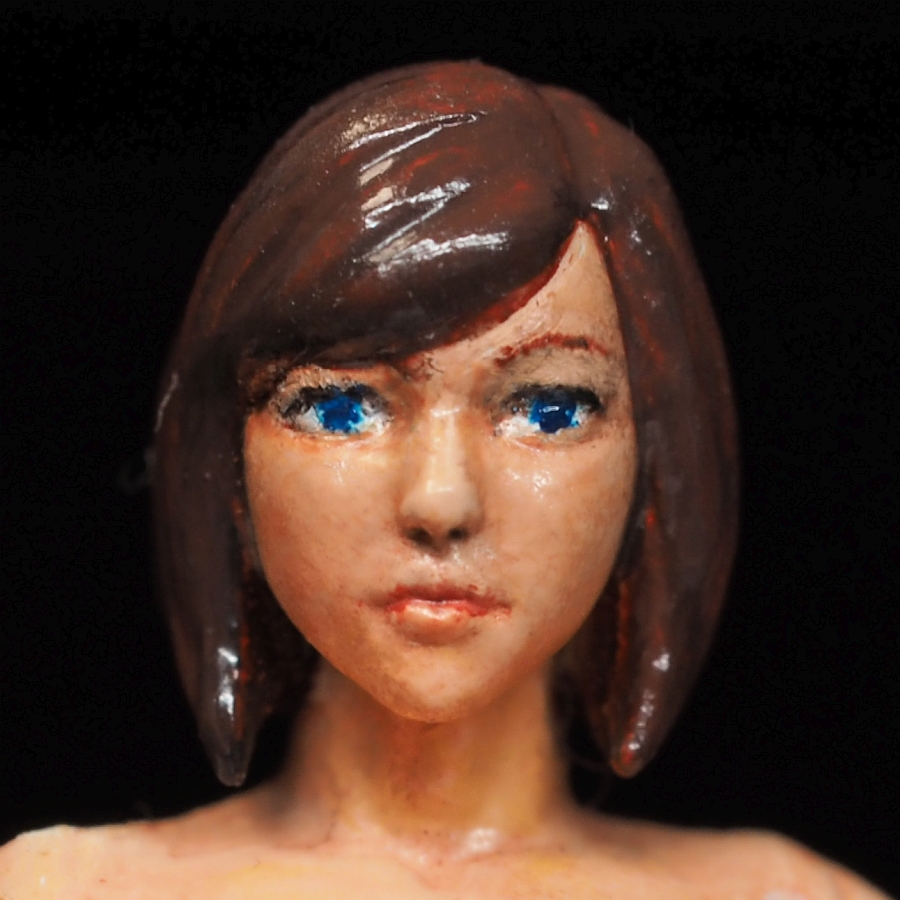 やり直せばいいものを、裸眼じゃよくわからんしという理由でそのままラッカー筆塗りで白目を書いて、タミヤアクリルのブルーで目玉を描いてみた。